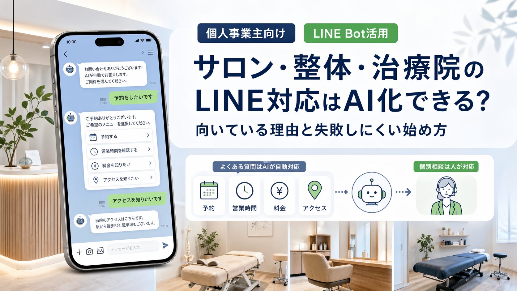 サロン、整体、治療院を個人で運営していると、LINEの問い合わせ対応にかなり時間を取られることがあります。 とくに施術中や接客中はすぐ返しにくく、営業時間外にも問い合わせが入りやすい業種です。