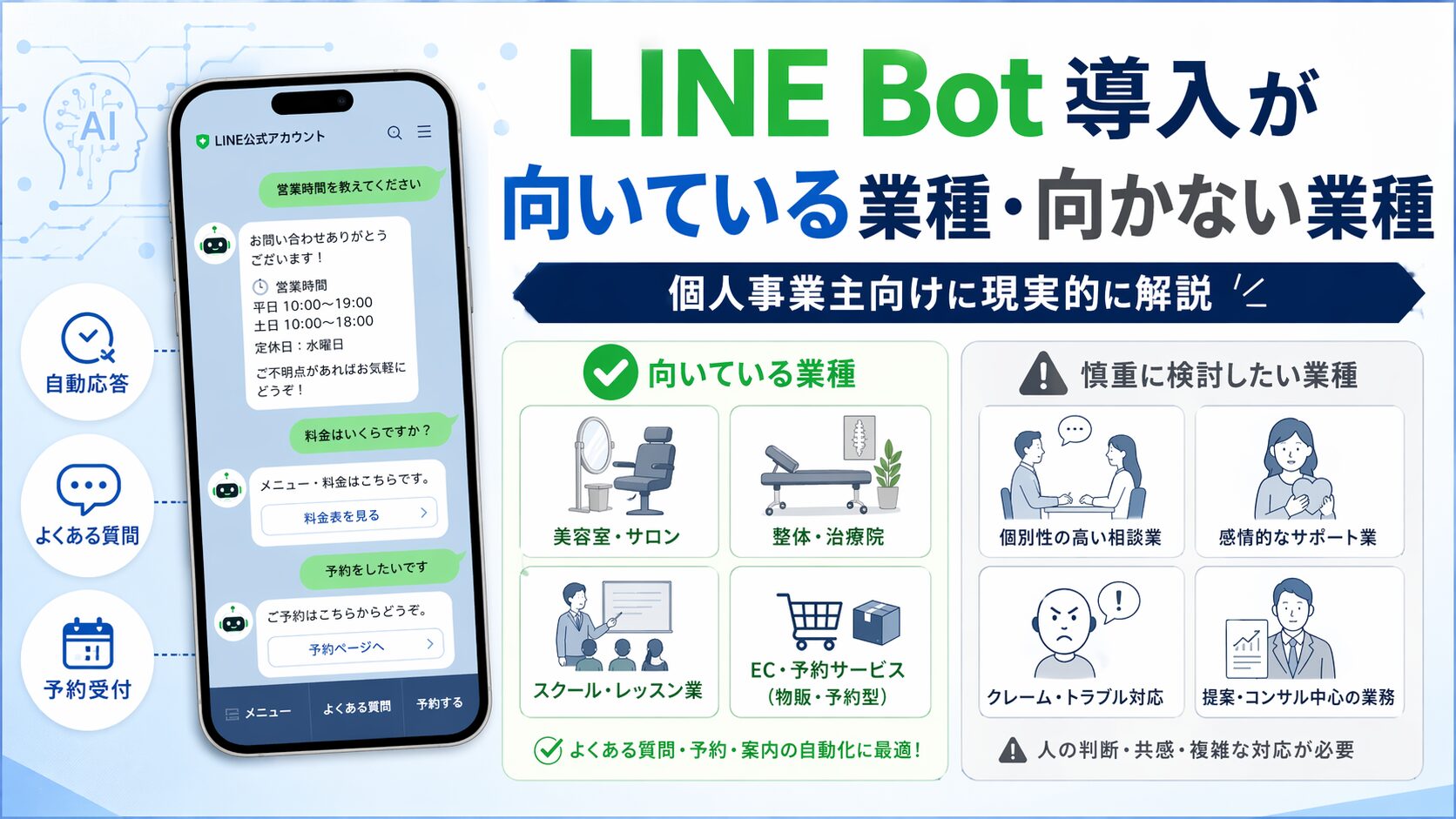 Botに任せてよいこと・人が残すべきことをもう少し細かく整理したい方は、 個人事業主のLINE対応はどこまでAI化できる?Botに任せる範囲と人が残すべき業務 を読むと判断しやすいです。